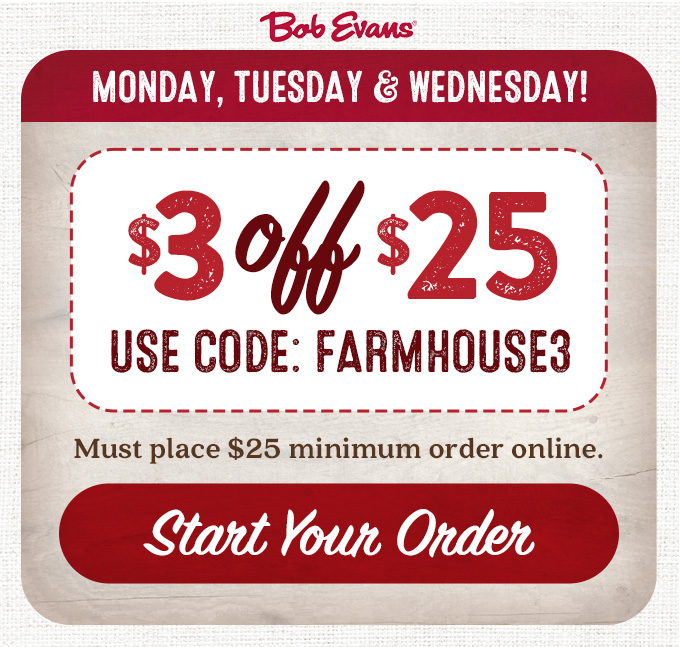 CLICK HERE for your Bob Evans coupon. Save $3 at Bob Evans Restaurant when you dine in or place an order online! Be sure to use Promo Code: FARMHOUSE3 at checkout for discount to apply. Coupon expires 8/9/23.