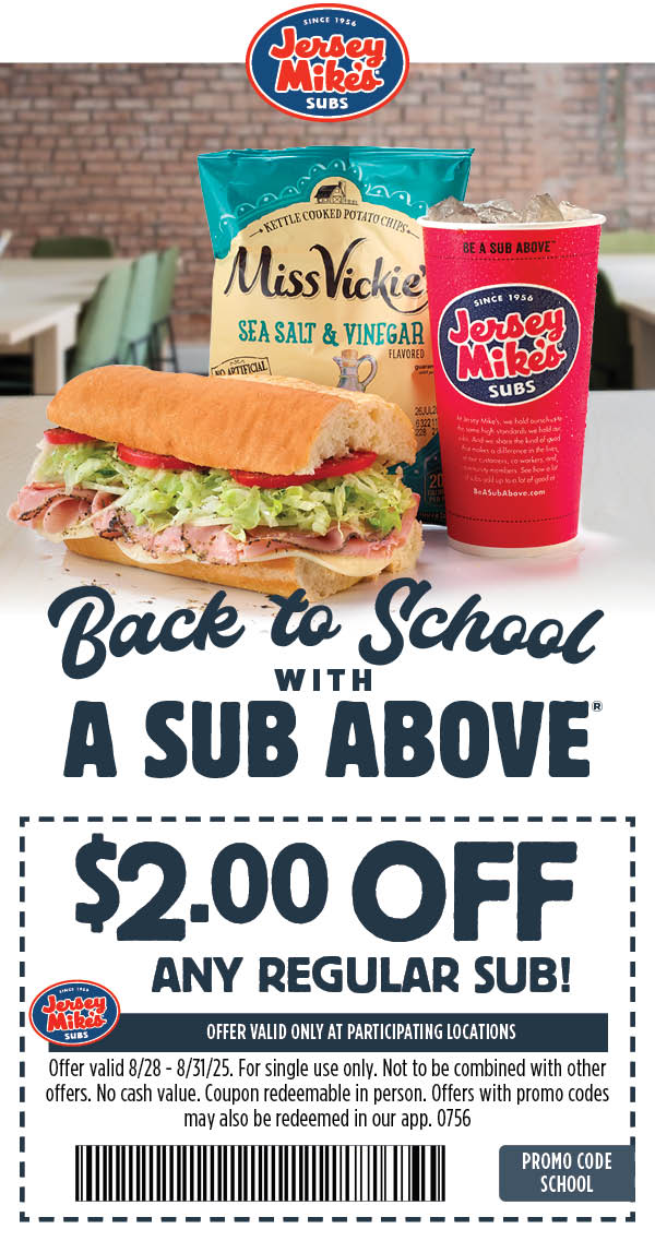 Get $2 off any Regular Sub at Jersey Mike’s when you show this coupon to your cashier! To find a Jersey Mike’s near you, just head over to their website by clicking here! Coupon valid through August 31, 2025!